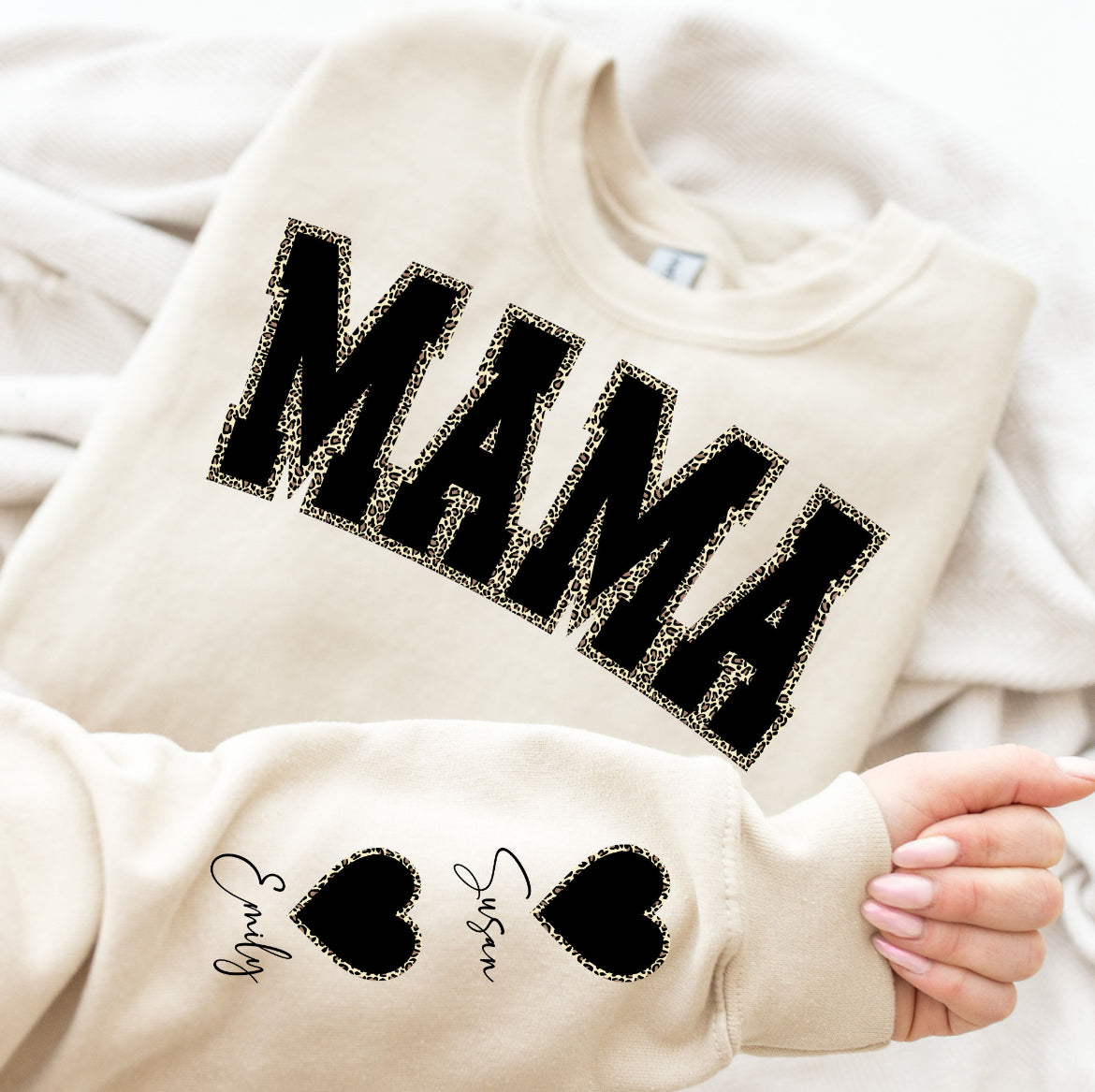 Leopard Print Mama Sweatshirt Kids Names on Sleeves